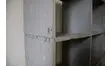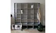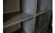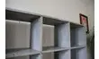 Grande bibliothèque en bois légèrement patinée d'un doux gris bleuté. Pratique grâce à ses nombreux casiers de rangement, on l'imagine dans un salon remplit de livres ou encore dans un atelier.