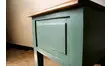 Restauré dans notre atelier, ce petit meuble a été poncé, peint puis vernis. Quelques notes du tanin sont ressorties créant un léger dégradé jaune à certains endroits.