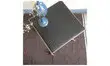 Petite tablette à roulettes des années 50-60, structure en métal doré et fils scoubidou noirs, plateau en skaï noir impeccable!