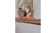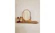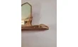 Petit miroir murale en forme d’écusson cerclé de laiton. La base en bois patinée sert d’étagère. On l’imagine dans une entrée, une salle de bain de style campagne chic… Idéal pour y disposer des souvenirs, des grigris…