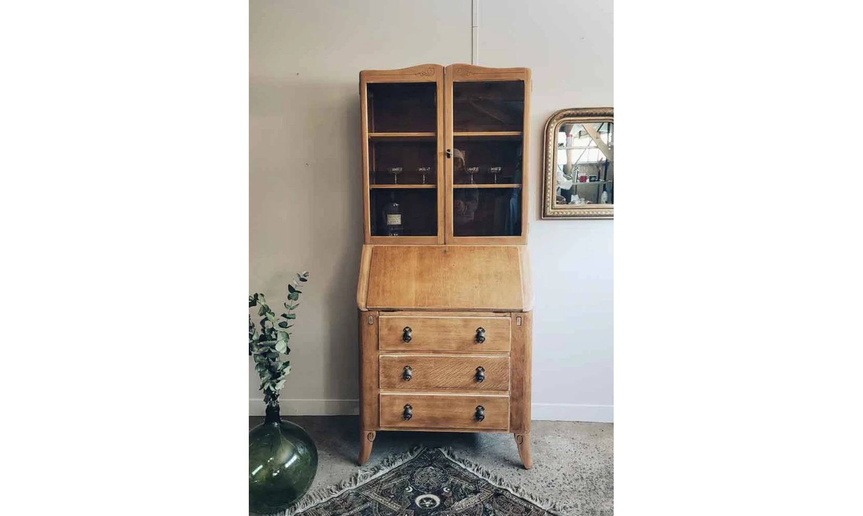Coup de cœur de Bits and Bobs pour ce superbe scriban anglais ! La teinte claire du bois et ses lignes courbes lui apportent beaucoup de douceur. On apprécie également sa polyvalence : Une partie bibliothèque, un espace bureau constitué de petits « pigeonholes » et une commode composée de trois tiroirs, dont les poignées en métal sont si joliment travaillées. Ses pieds galbés, légèrement sculptés, ajoutent un charme certain à ce meuble.